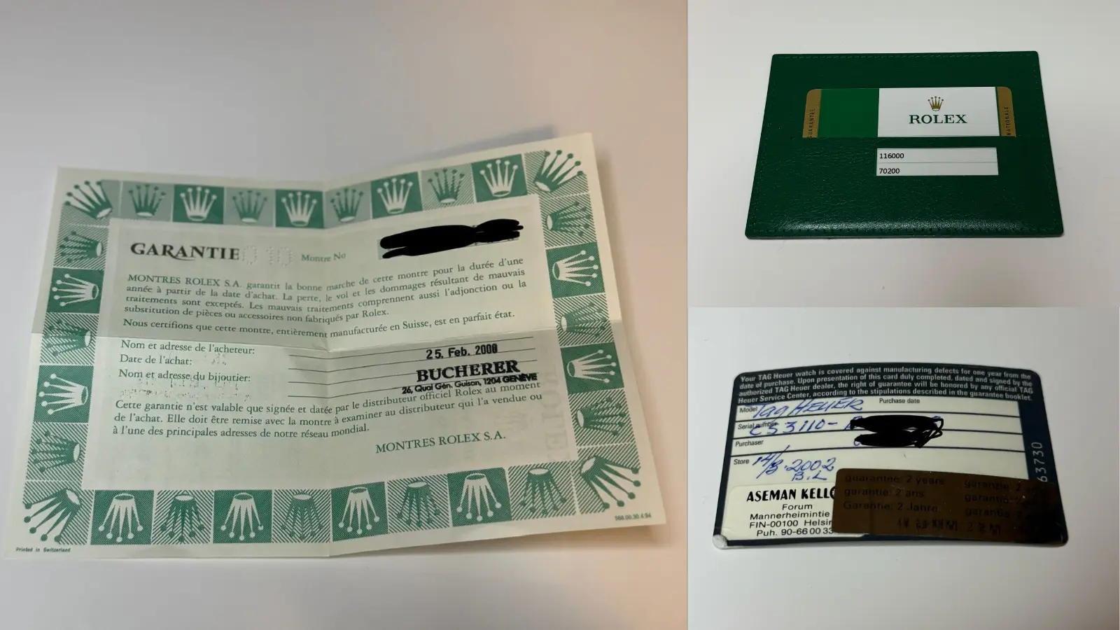 Hintaan vaikuttaa myös se löytyykö esim. kello ja paperit, tai kello ja laatikko, eli osa full settiä, mutta ei kuitenkaan full set. Kaikki lisä on yleensä plussaa.