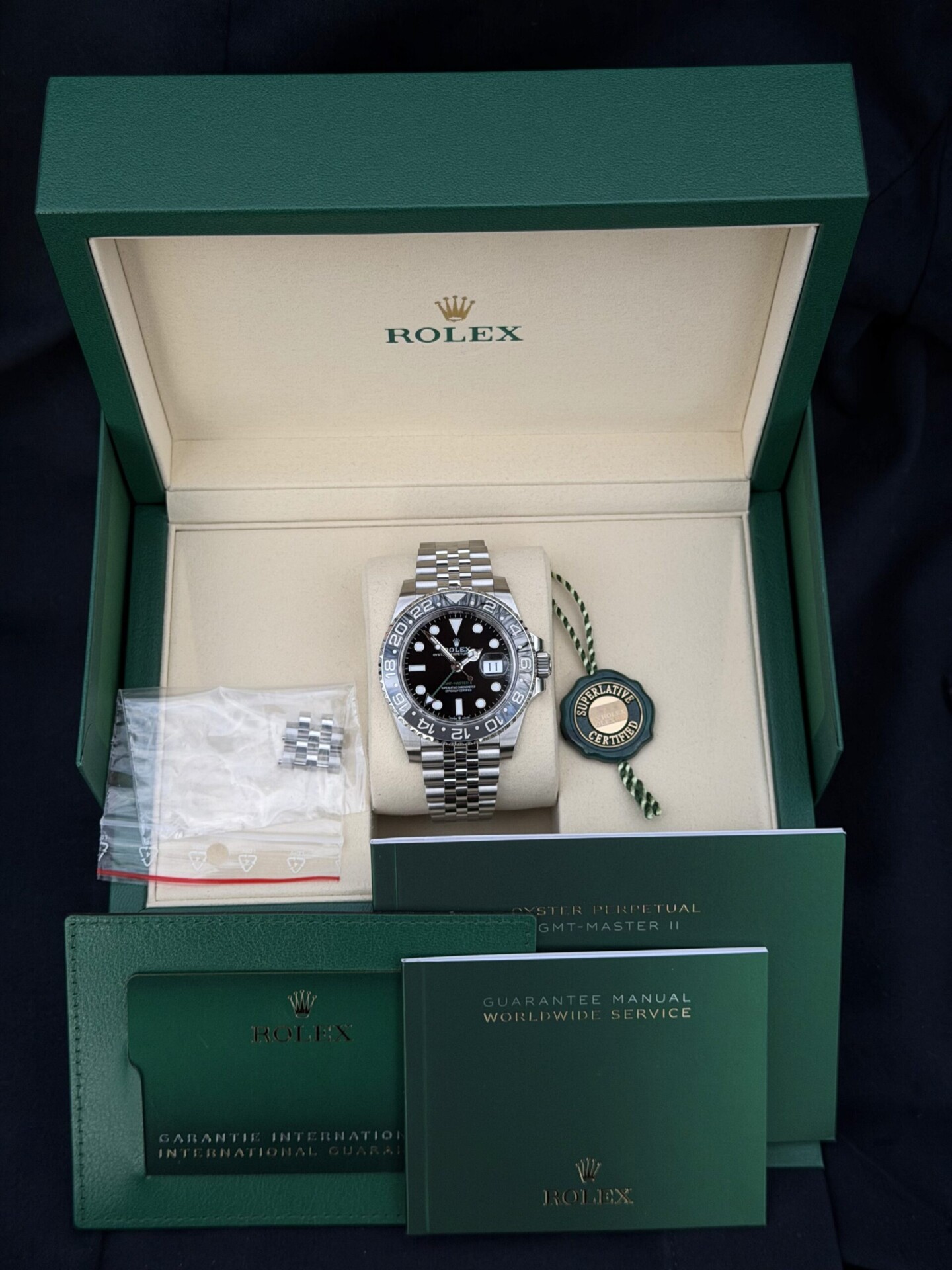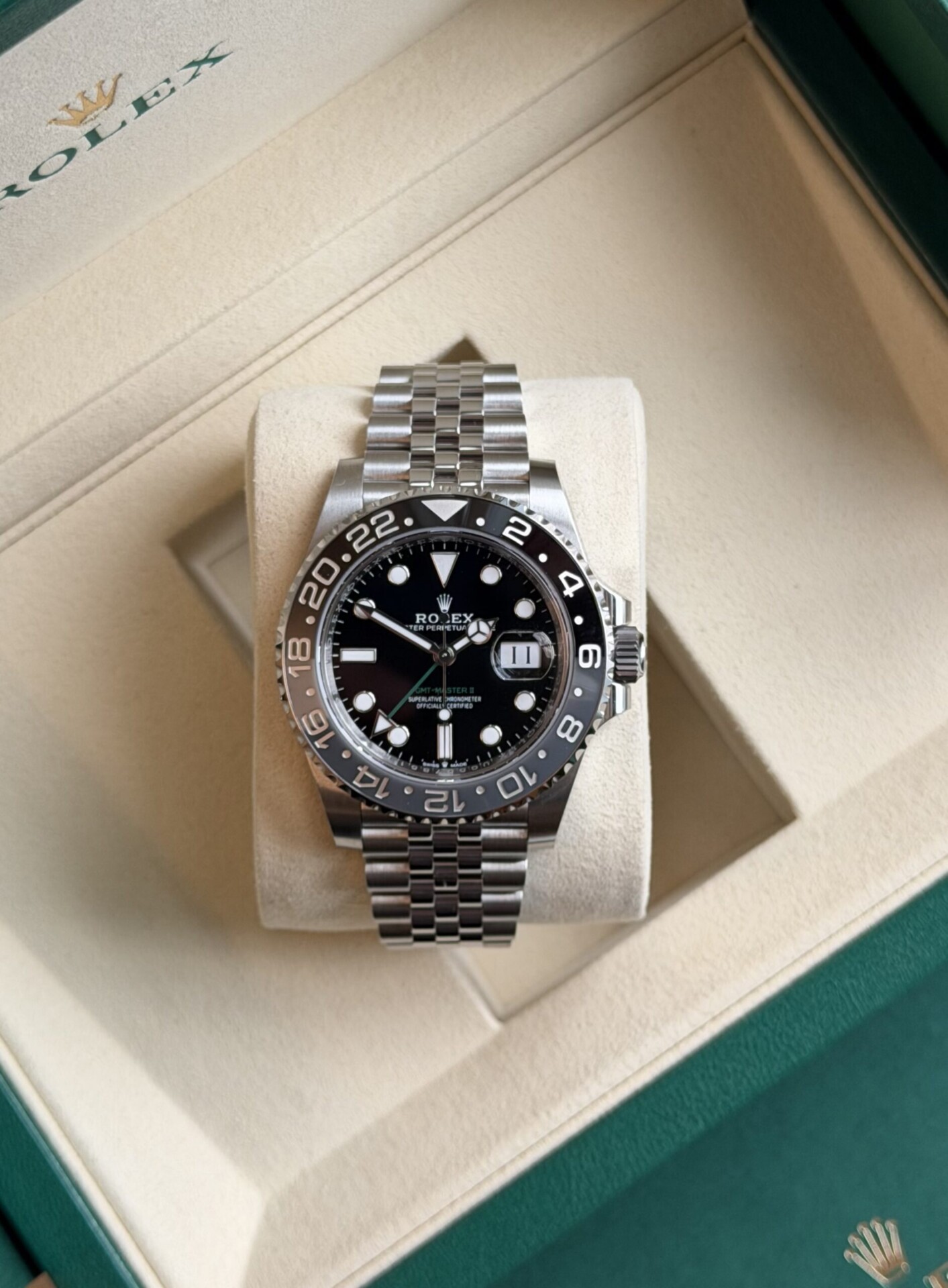 Käyttämätön Rolex GMT-Master II “Bruce Wayne” (11/2025). Tämä haluttu GMT-Master II yhdistää upean mustaharmaan keraamisen kehän ja jubilee-rannekkeen. Moderni väriyhdistelmä ja Rolexin viimeisin tekninen toteutus tekevät kellosta sekä elegantin että sporttisen valinnan jokaiseen tilanteeseen. Takuu: Valmistajan takuu voimassa 11/2030 saakka.