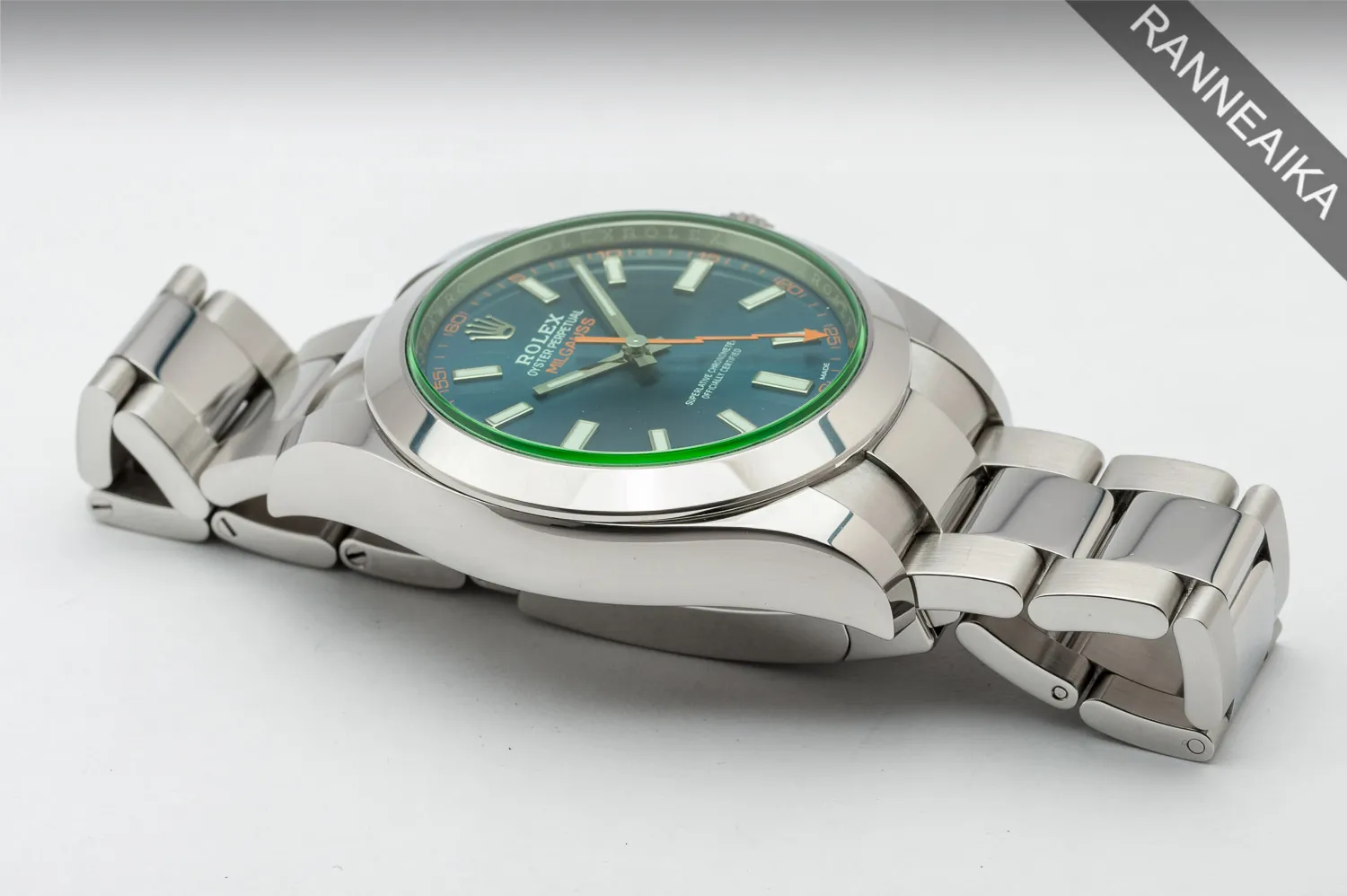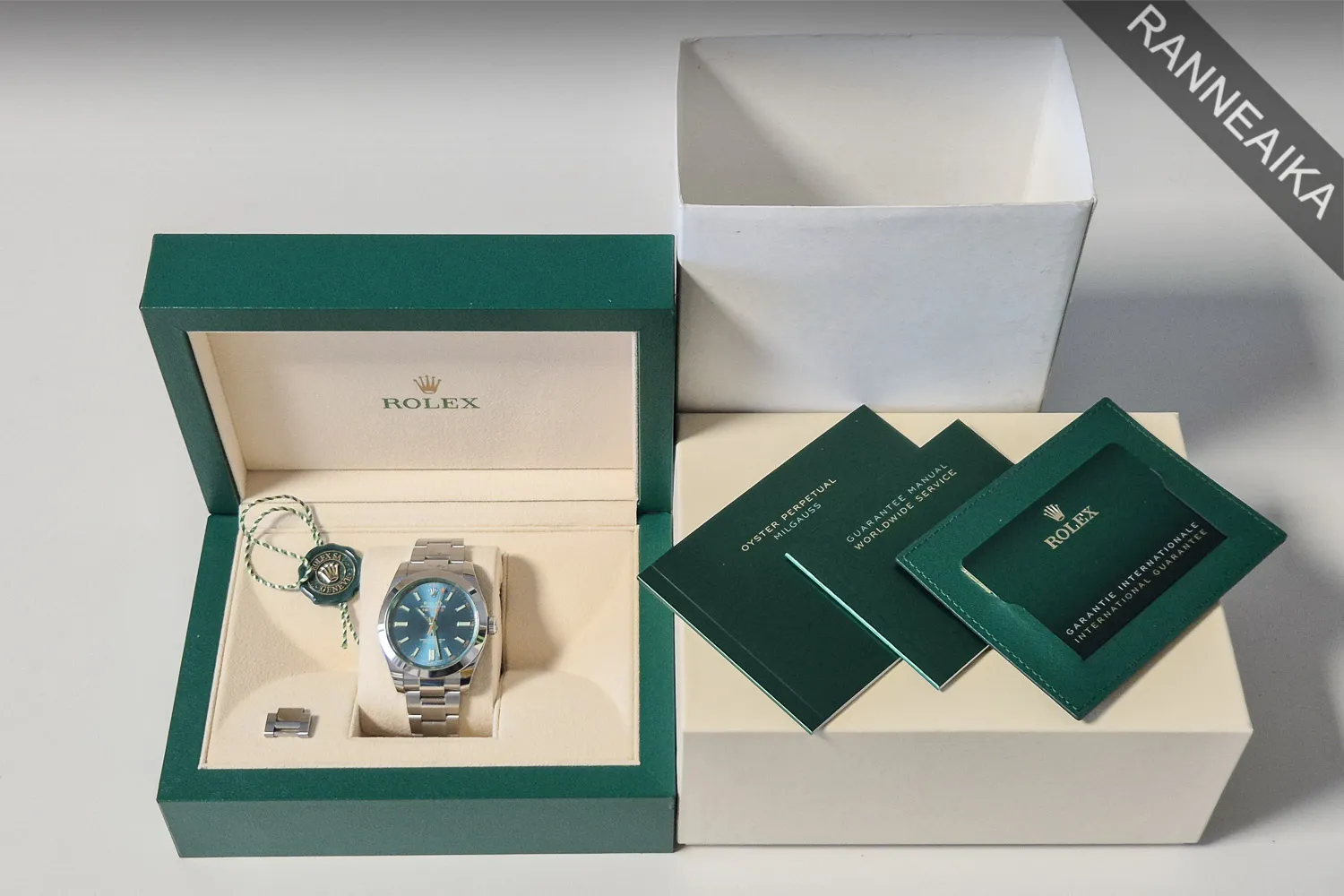 Huippukuntoinen sinisellä taululla, vihreällä lasilla sekä oranssilla sekuntiosoittimella varustettu Milgauss. Näyttävä Z-Blue -taulu yhdessä 904L-teräksestä valmistetun kuoren sekä kiillotetuin keskipaloin viimeistellyn kolmirivisen oyster-rannekkeen kanssa muodostavat erittäin näyttävän kokonaisuuden, joka ei varmasti jää huomaamatta! Magneettisuojatun kuoren sisällä tikittää tarkasti Rolex 3131 -automaattikaliiperi. Kellon takuukortti on päivätty 09/2022 ja valmistajan takuu on voimassa 09/2027 asti – kyseessä on uusikorttinen, aivan tuotannon loppupään yksilöitä. Mukana seuraa alkuperäinen ostokuitti (kotimaiselta Rolex-jälleenmyyjältä) alkuperäinen takuukortti, korttitasku, käyttöopas, huolto-opas sekä molemmat laatikot + kartonkinen suojahiha. Tästä todella haluttu ja loistavassa kunnossa oleva Milgauss käyttöön tai keräilyyn!