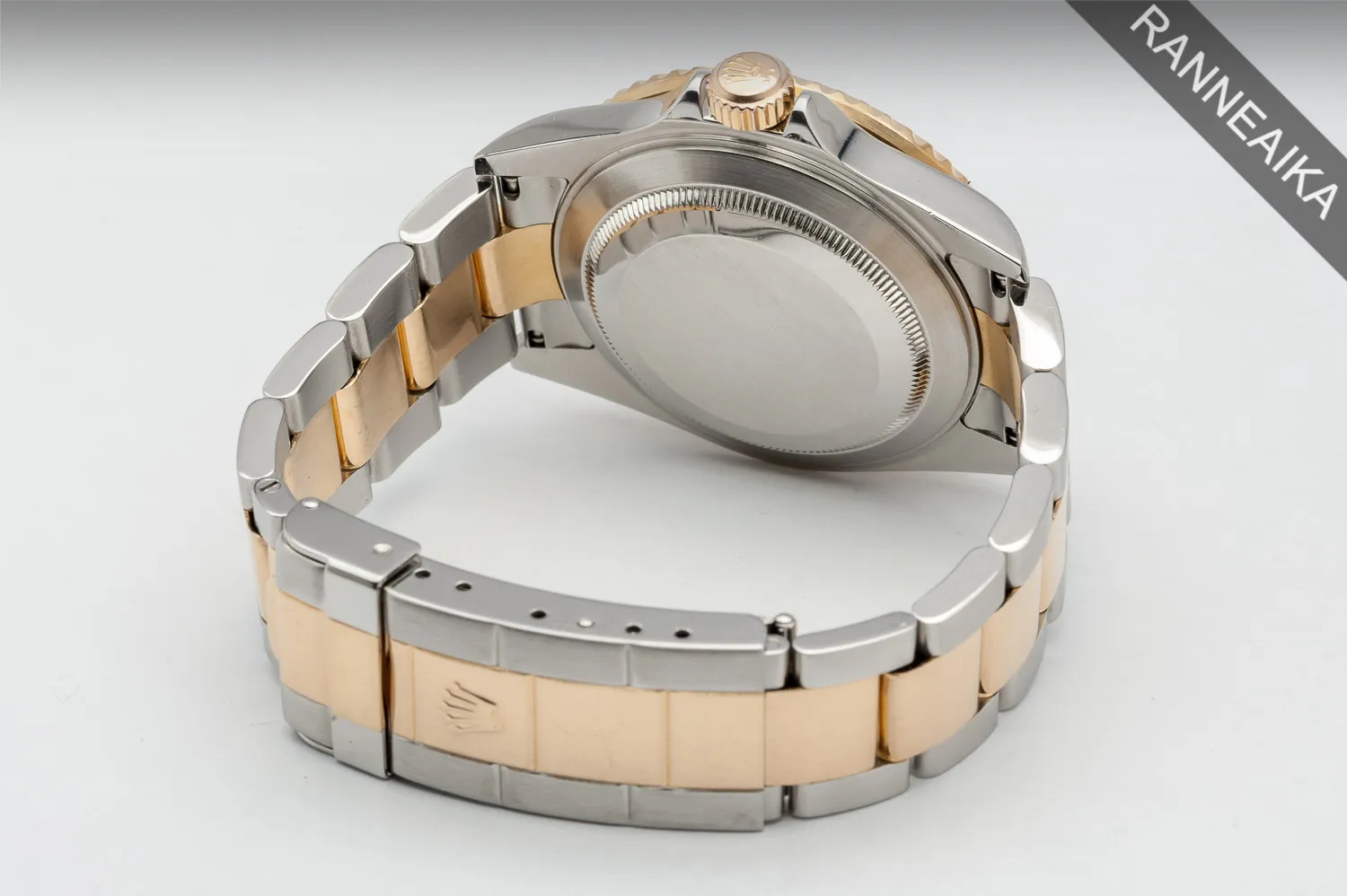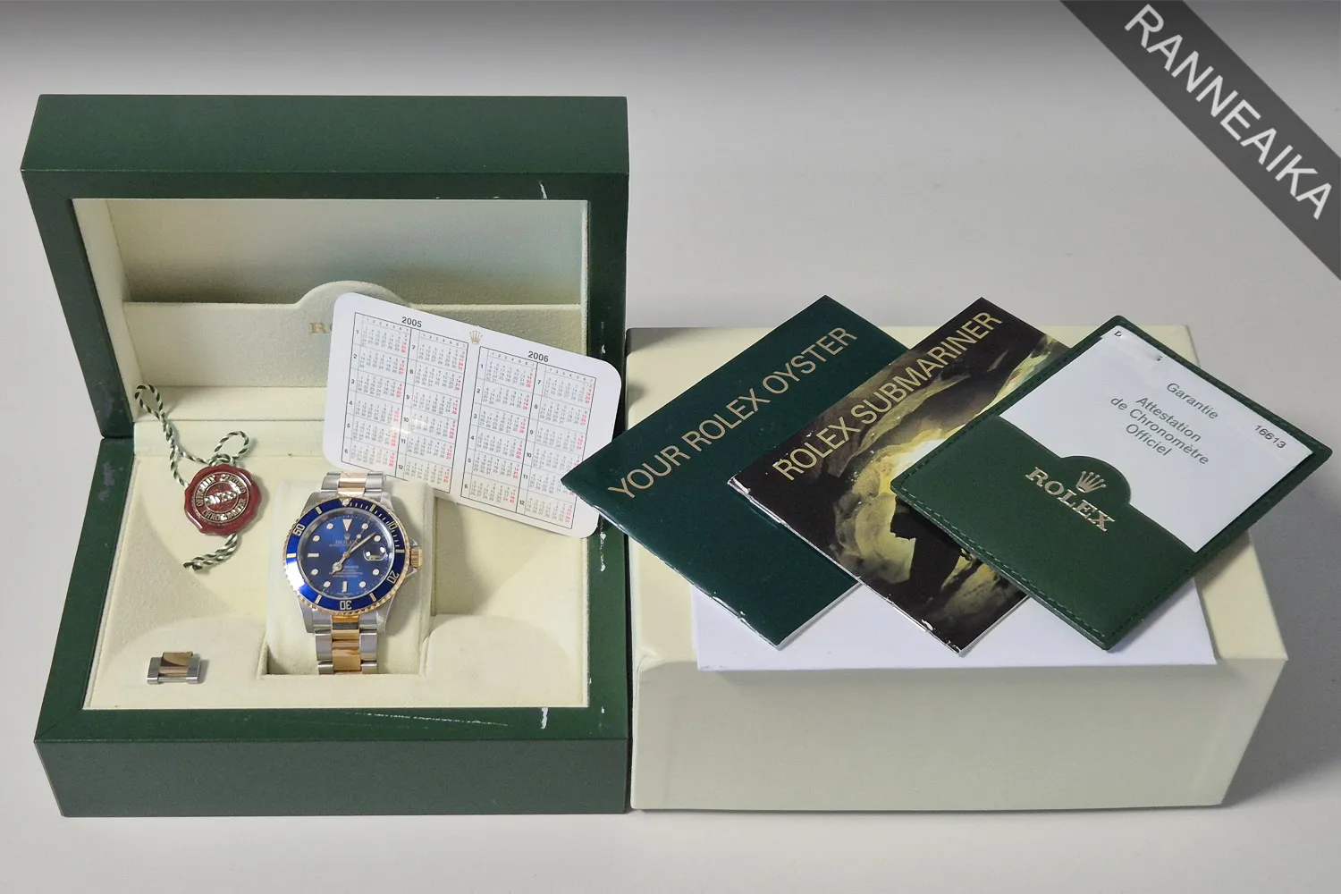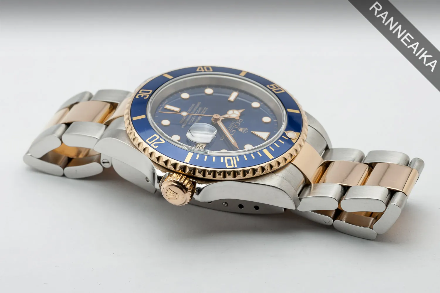 Upea keraamisella kehällä ja päivyrillä varustettu diver jonka nuppi, kehä sekä kolmirivisen rannekkeen umpinaiset keskipalat ovat 18K keltakultaa. Sininen kehä sekä niin ikään aurinkohiottu sininen taulu ovat todella näyttävä kokonaisuus joka ei ihmeempiä esittelyjä kaipaa – tämä kello käy upeasti niin arkeen kuin juhlaankin! Edessä kestävä safiirilasi ja teräksisen takakannen suojassa tikittää luotettava cal. 3135 -automaattikoneisto. Kellon alkuperäinen takuutodistus on päivätty 10/2005 ja se käy erinomaisesti. Mukaan tulee alkuperäinen takuutodistus, takuutodistustasku, käyttöopas, takuuopas, hang tag, kalenterikortti sekä molemmat laatikot.