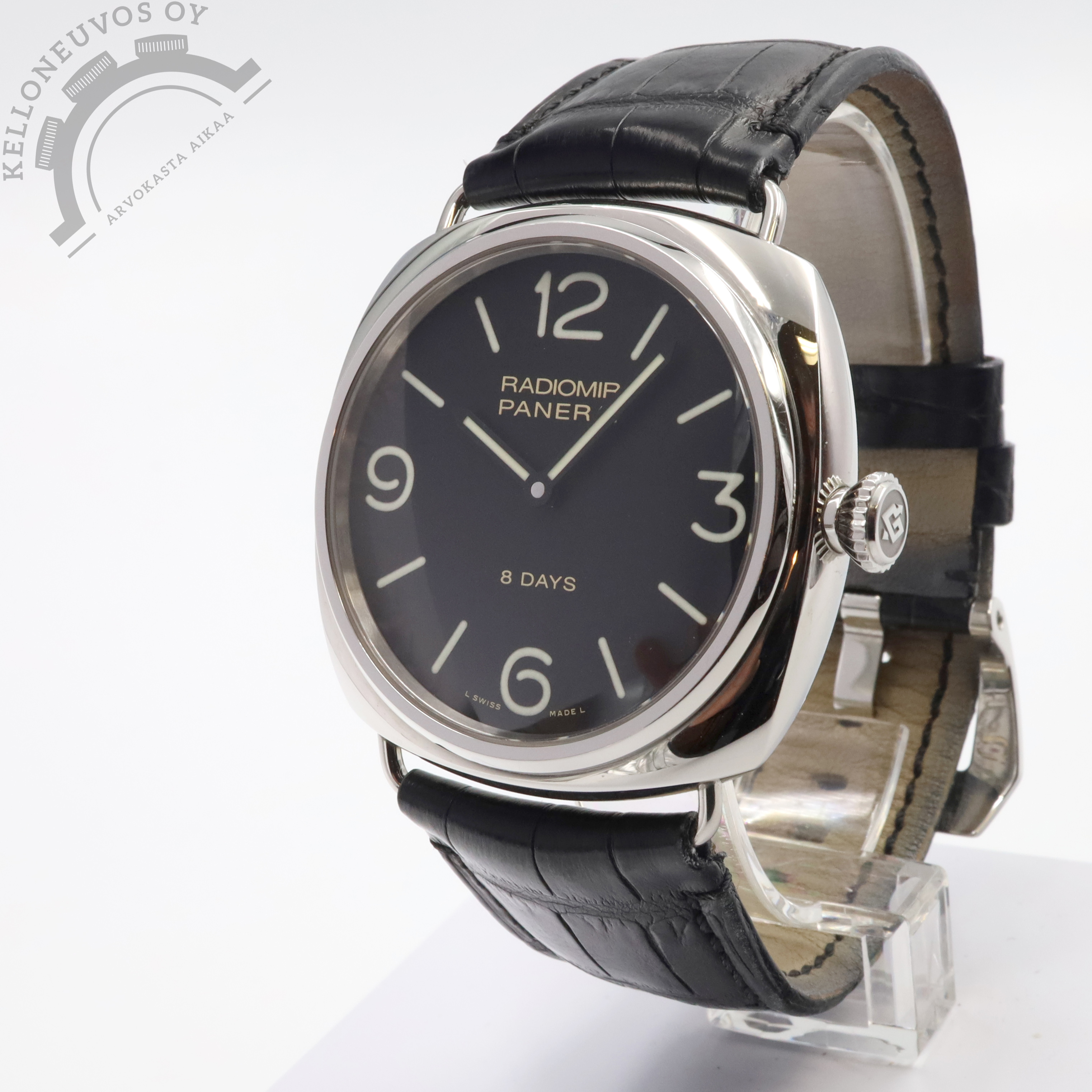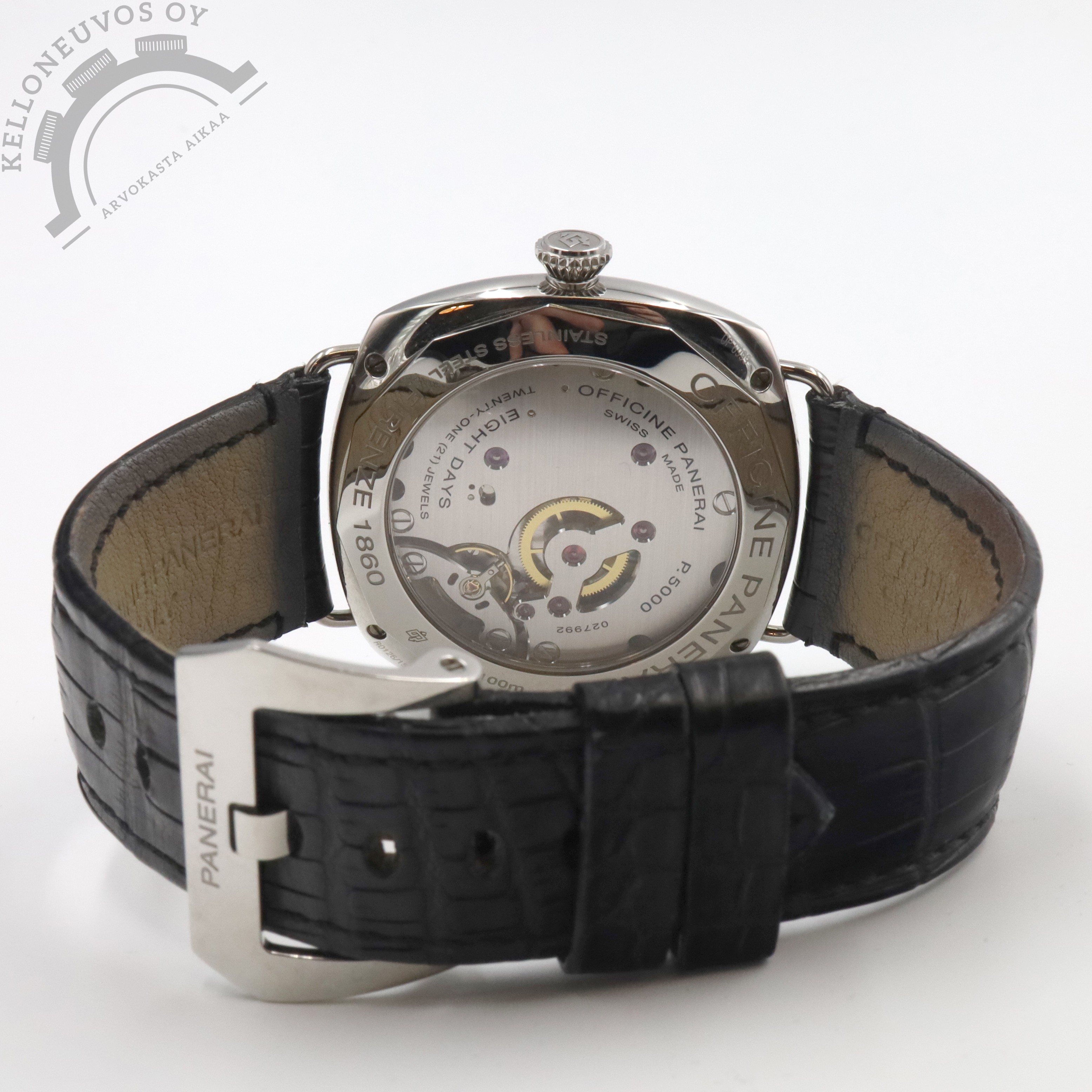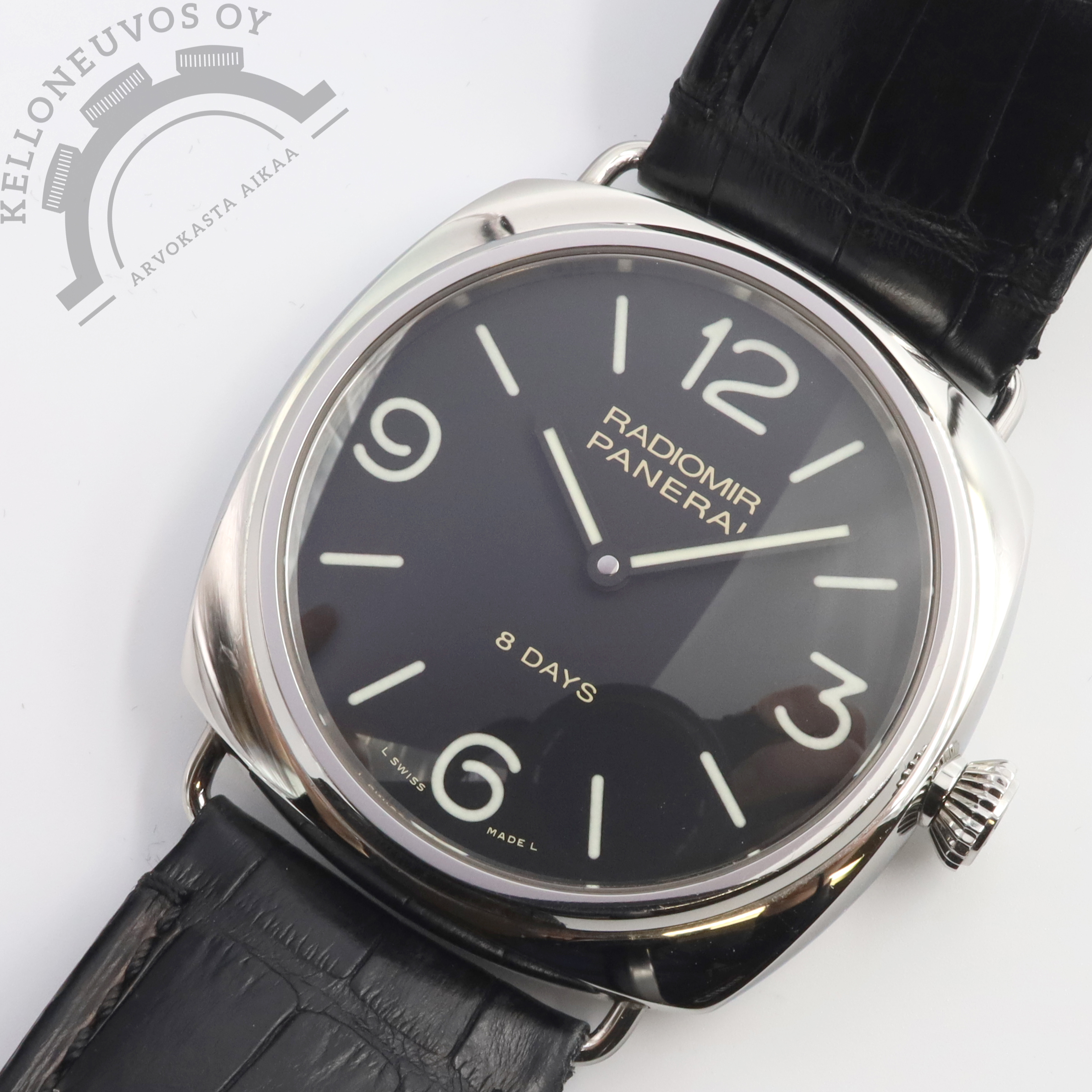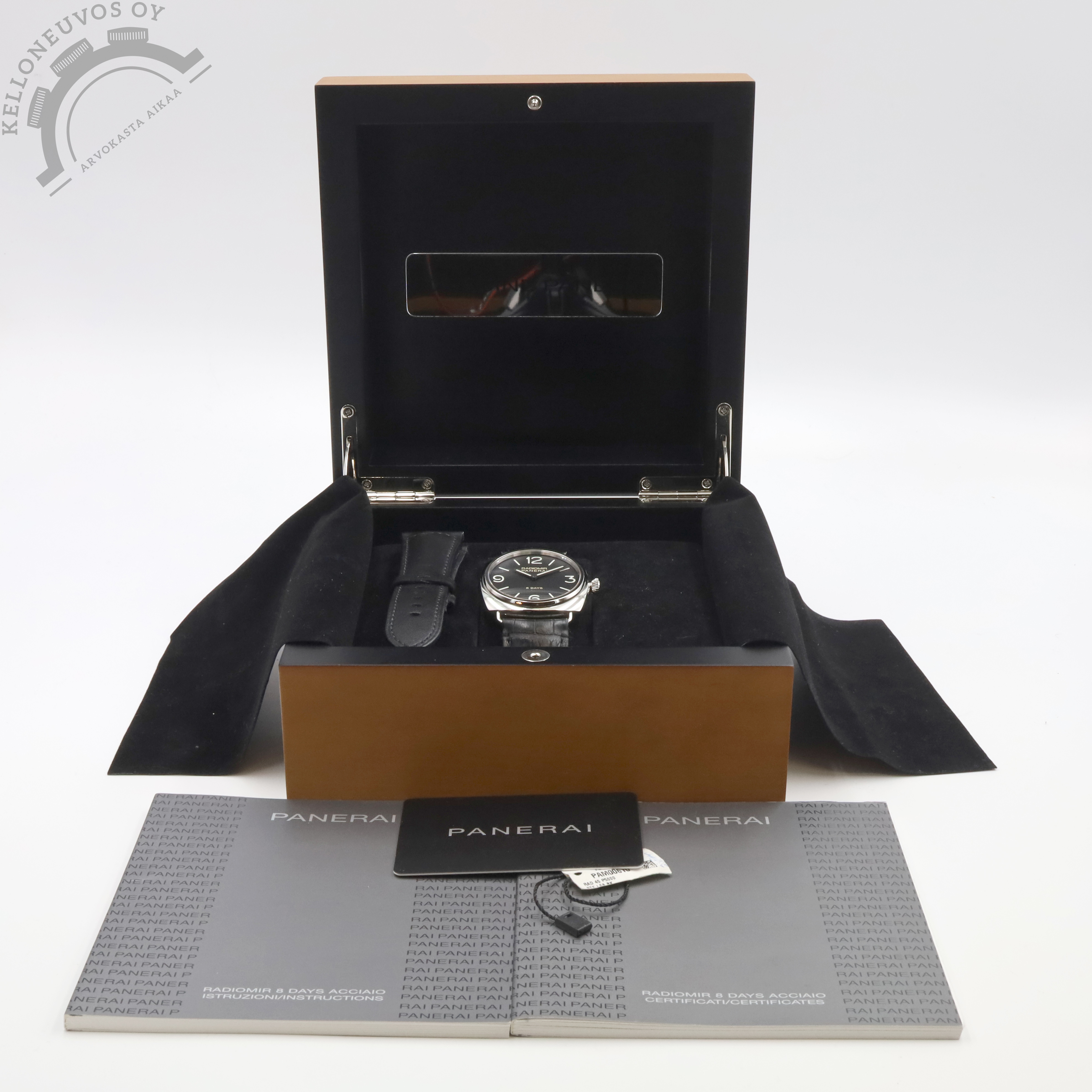 Tarjolle tyylikäs 8 päivän käyntivaralla varustettu Radiomir. Selkeälukuisella mustalla sandwich-taululla jossa loistava lume. Teräksinen kuori lankalugeilla ja tyylikkäällä mustalla nahkarannekkeella. Safiirilasit molemmin puolin runkoa, takakannen alla tikkaa tarkasti Panerai P.5000 -manuaalikoneisto. Kelloa seuraa laatikko, manuaalit, hang tag, toinen Panearin oma musta nahkaranneke sekä takuukortti. Kellon takuukortti on päivätty 12/2021.