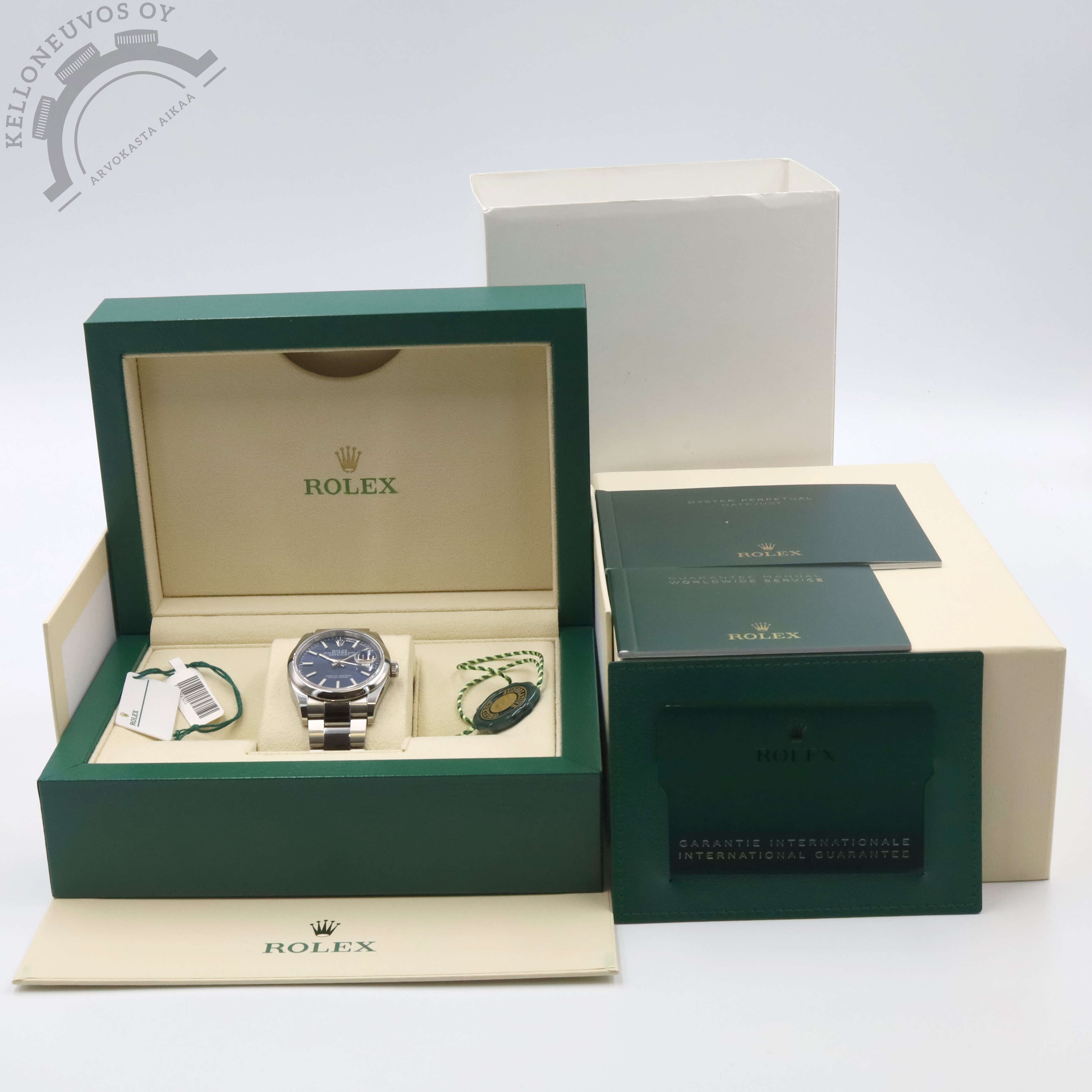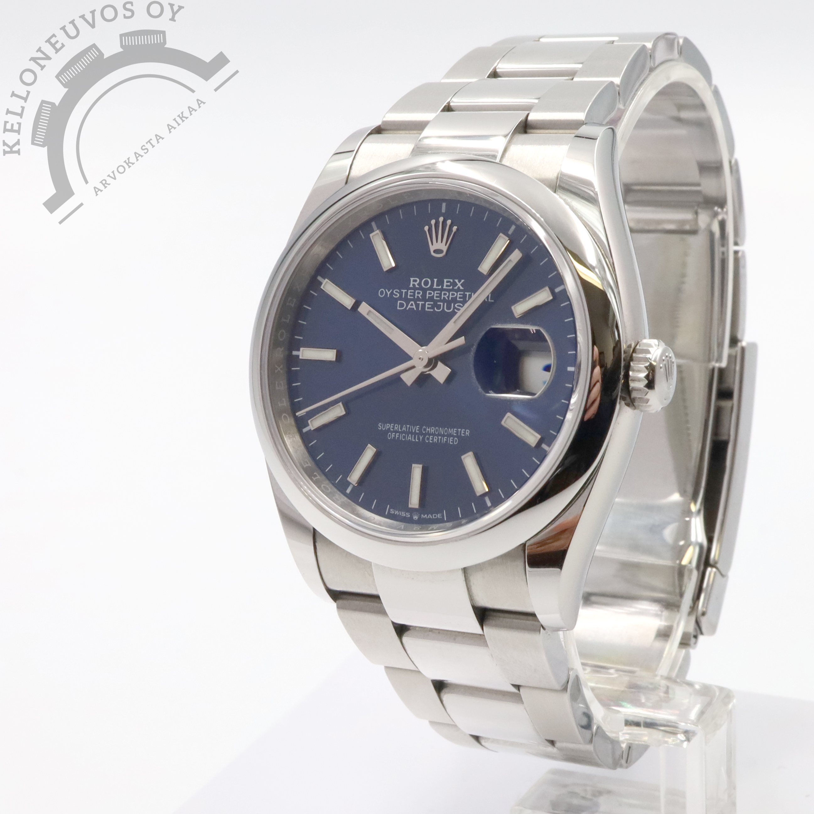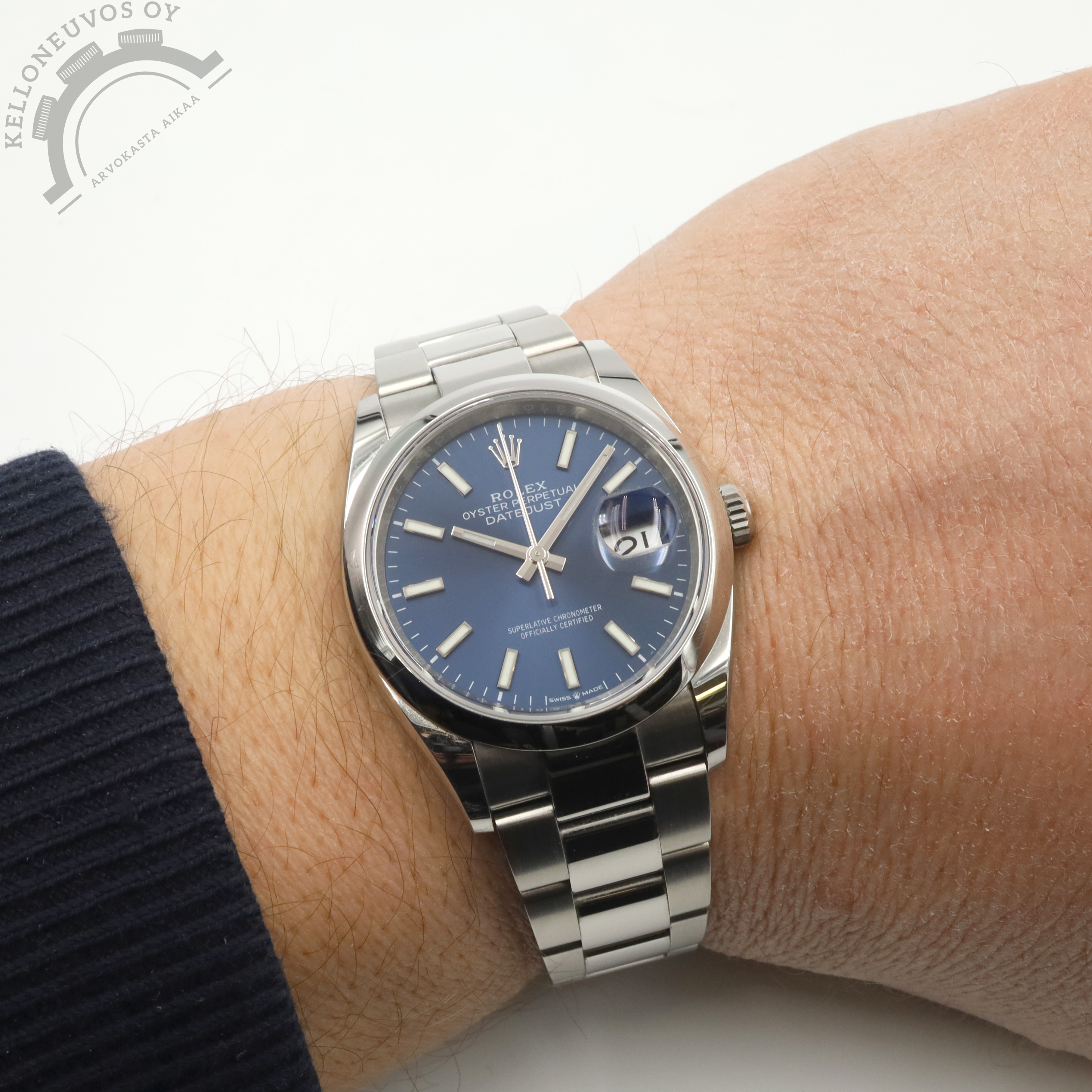 Kelloneuvos Oy – Arvokelloja turvallisesti ja asiantuntevasti jo vuodesta 2016! Toimistomme sijaitsee Turun ydinkeskustassa Kivikartanon kiinteistössä jonne olet aina tervetullut kaupoille. Rolex Oyster Perpetual Datejust 36 7 890 € / Vaihto. Kellot ostettavissa suoraan myös verkkokaupastamme. Tarjolle tyylikäs 36mm koossa oleva Datejust. Näyttävällä sekä selkeälukuisella sinisellä taululla jossa päivyri. Teräksinen kuori, smooth bezel sekä laadukas teräsranneke jossa keskipalat kiillotettua ja sivut harjattua terästä. Safiirilasi suojaa kellon etupuolta kun taas teräksisen takakannen alla tikkaa tarkasti Rolex 3235- automaatti jossa mukava 70h käyntivara. Full set, kellon takuukortti on päivätty 8/2022. Malli: 126200 Kuoren halkaisija: 36mm Rannekkeen leveys: 20mm Koneisto: 3235, automaatti Vesitiiviys: 100m Takuu: Valmistajan takuu voimassa 8/2027 asti Vaihdot OK. Yhteystiedot: jesse@kelloneuvos.fi 045-6384734 Y-tunnus: 2747261-4 Kaupat hoituu turvallisesti ja helposti toimistollamme Turun keskustassa tai sovittaessa todella joustavasti toisaalla, postitse aina ilmainen sekä vakuutettu toimitus ympäri Suomen. Kaikki sivuiltamme löytyvät kellot ovat omaa varastoamme ja näin ollen välittömästi saatavilla. Katso kaikki myynnissä olevat kellot: https://kelloneuvos.fi/ Seuraa: www.facebook.com/kelloneuvos www.instagram.com/kelloneuvos #Kelloneuvos