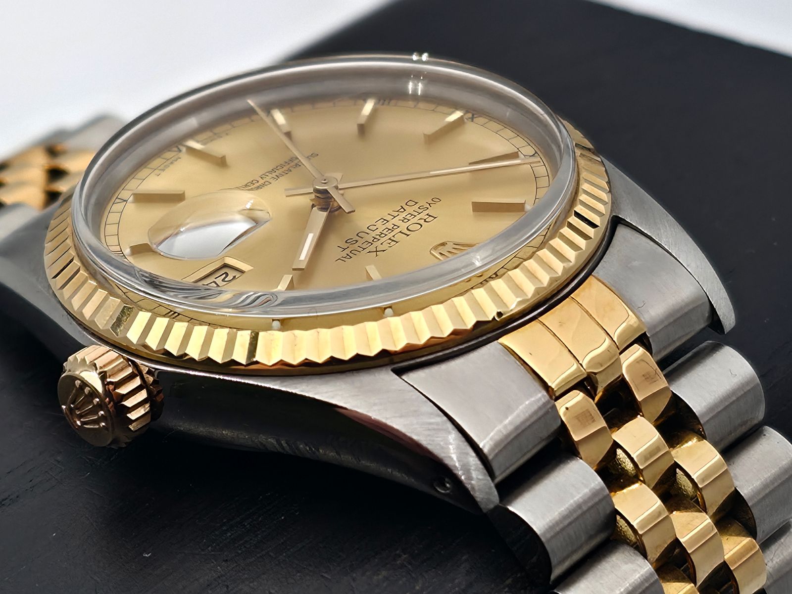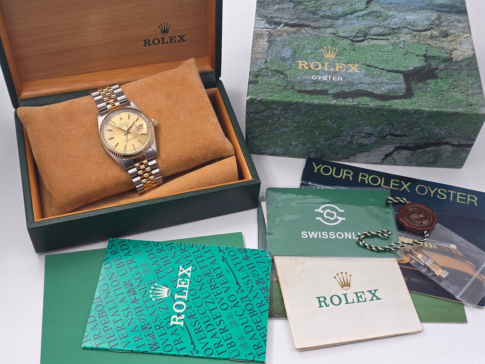 Klassikkojen klassikko! Rolex Datejust 36mm. Erinomaisessa kunnossa oleva fullset (04/1988). Käynti on tarkka, käyntiraportti mukaan. Ranneke on jämäkkä, ja kuori sekä bezel ovat moitteettomassa kunnossa. Tästä yksi kellomaailman ikonisimmista malleista!