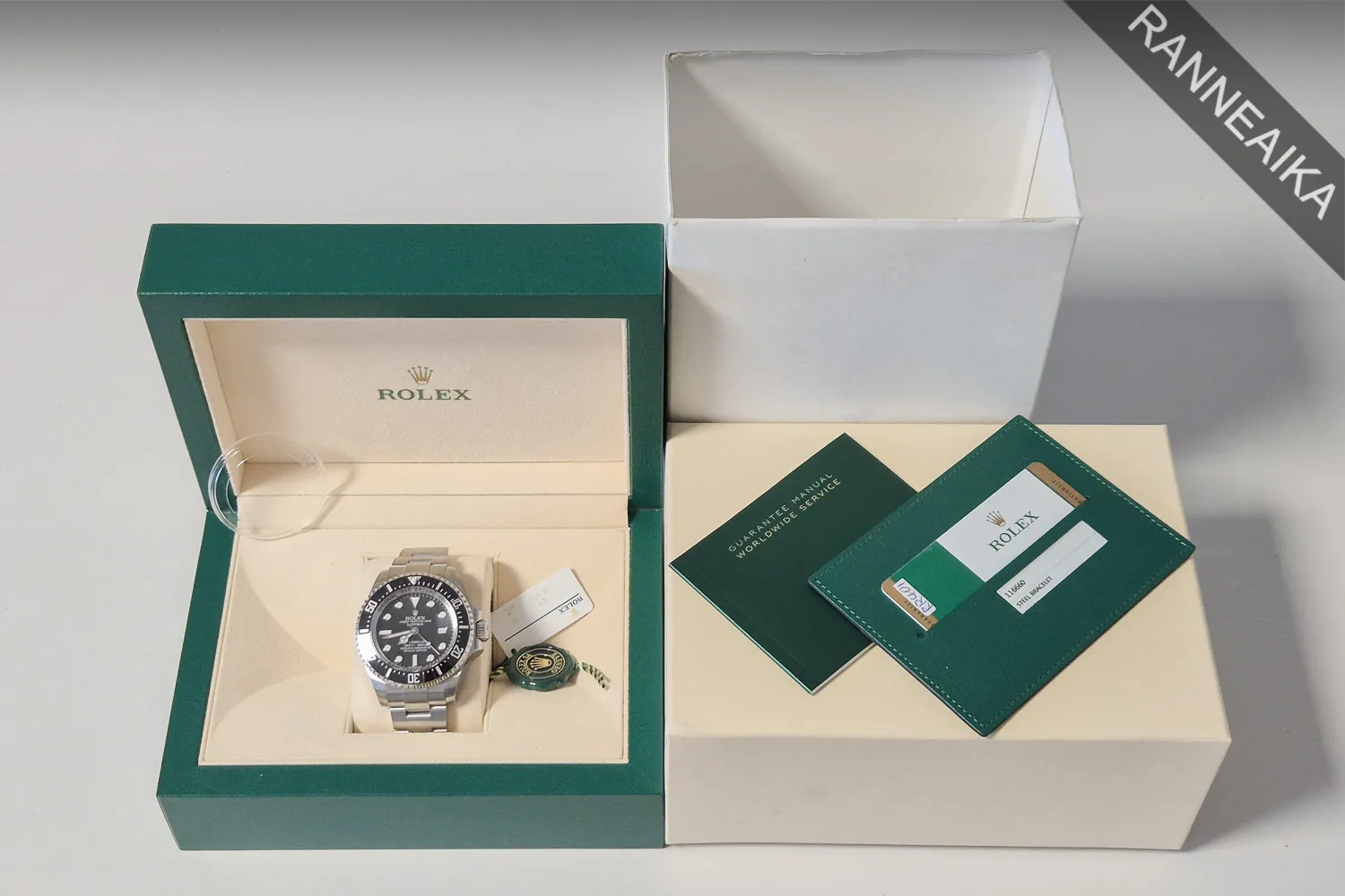 Käyttämätön, todella näyttävä ja haluttu Deepsea mustalla taululla sekä keraamisella kehällä. Kyseessä on täysin käyttämätön NOS-yksilö (New Old Stock) alkuperäisissä suojamuoveissaan. Teräksinen 44mm kuori ja harjattu teräsranneke, jossa kätevä pituuden hienosäätö sekä sukeltajanjatke. Tällä kellolla uskaltaa pulahtaa hieman syvemmässäkin paljussa, sillä sille luvataan peräti 3900 metrin vesitiiviys. Kellon takuukortti on päivätty 10/2016. Mukaan alkuperäinen takuukortti, korttitasku, huolto-opas, molemmat hang tagit sekä molemmat laatikot + kartonkinen suojahiha. Tästä takuunäyttävä ja suosittu keräilytason diver!