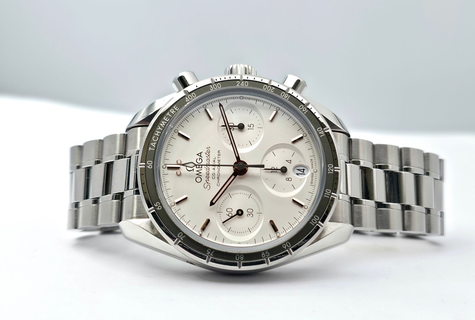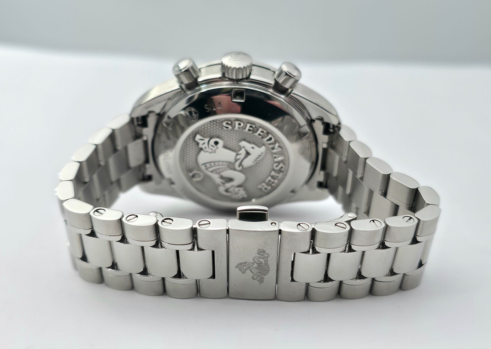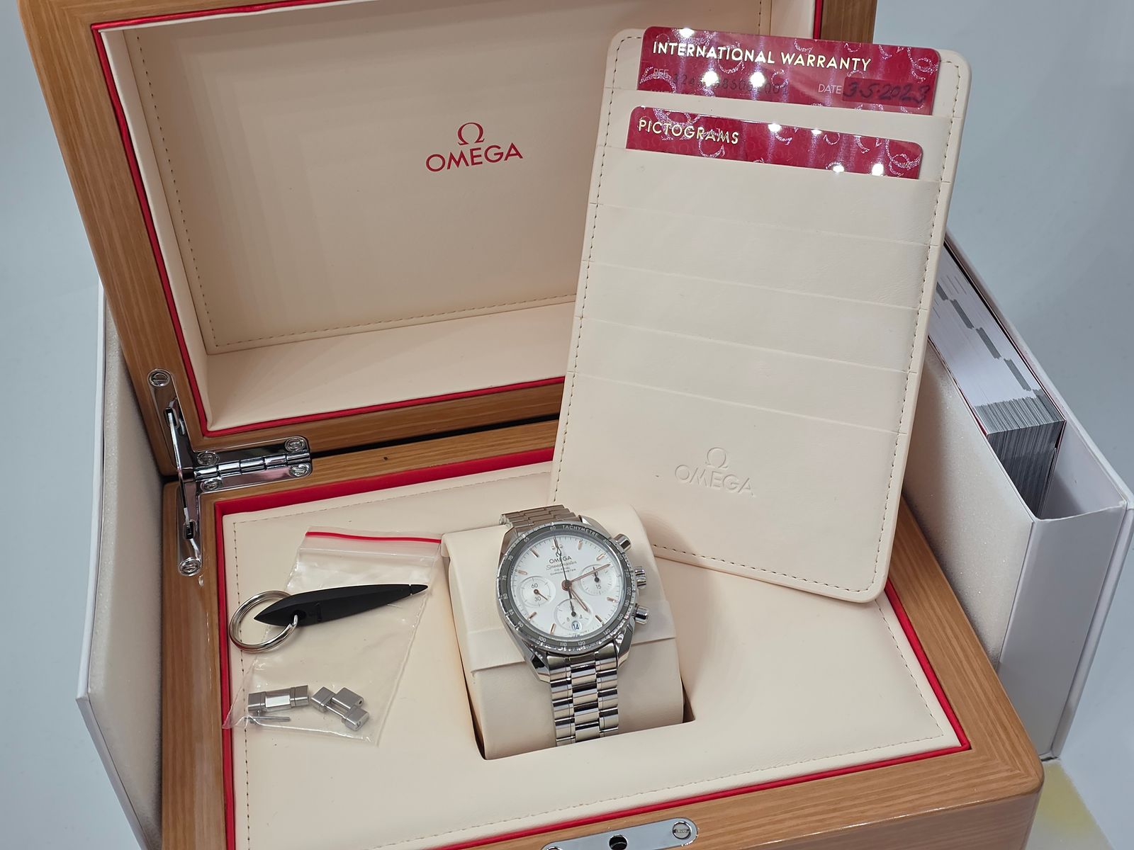 Uudistettu versio 38mm automaatti Speedmasterista. Todella siistissä kunnossa. Näyttävä Speedy hopeanhohtoisella taululla, jossa punakultaiset indeksit ja viisarit. Boksit, käyttöohje, kortit 05/2023 tehdastakuu voimassa 05/2028 asti. Ovh. 6400e