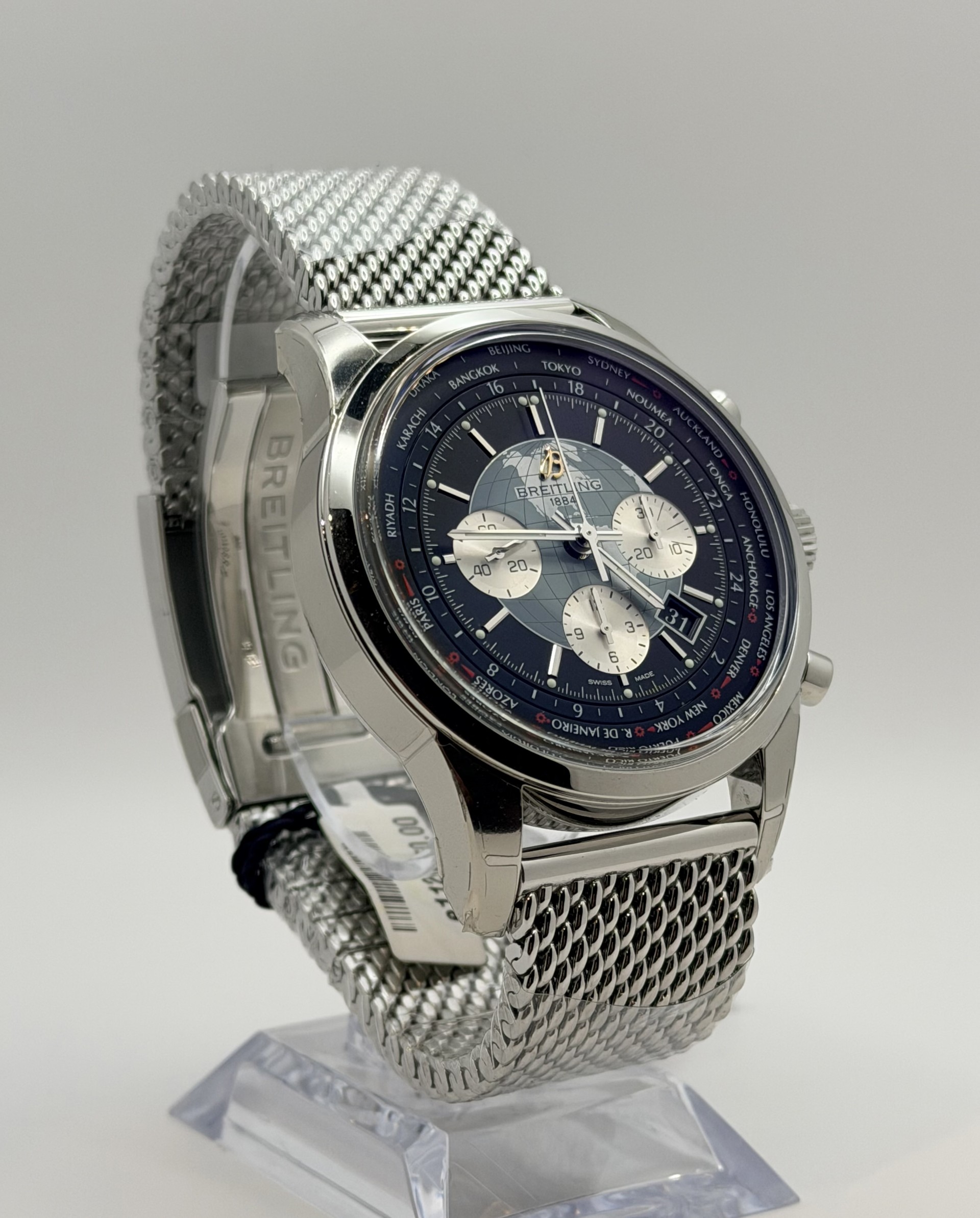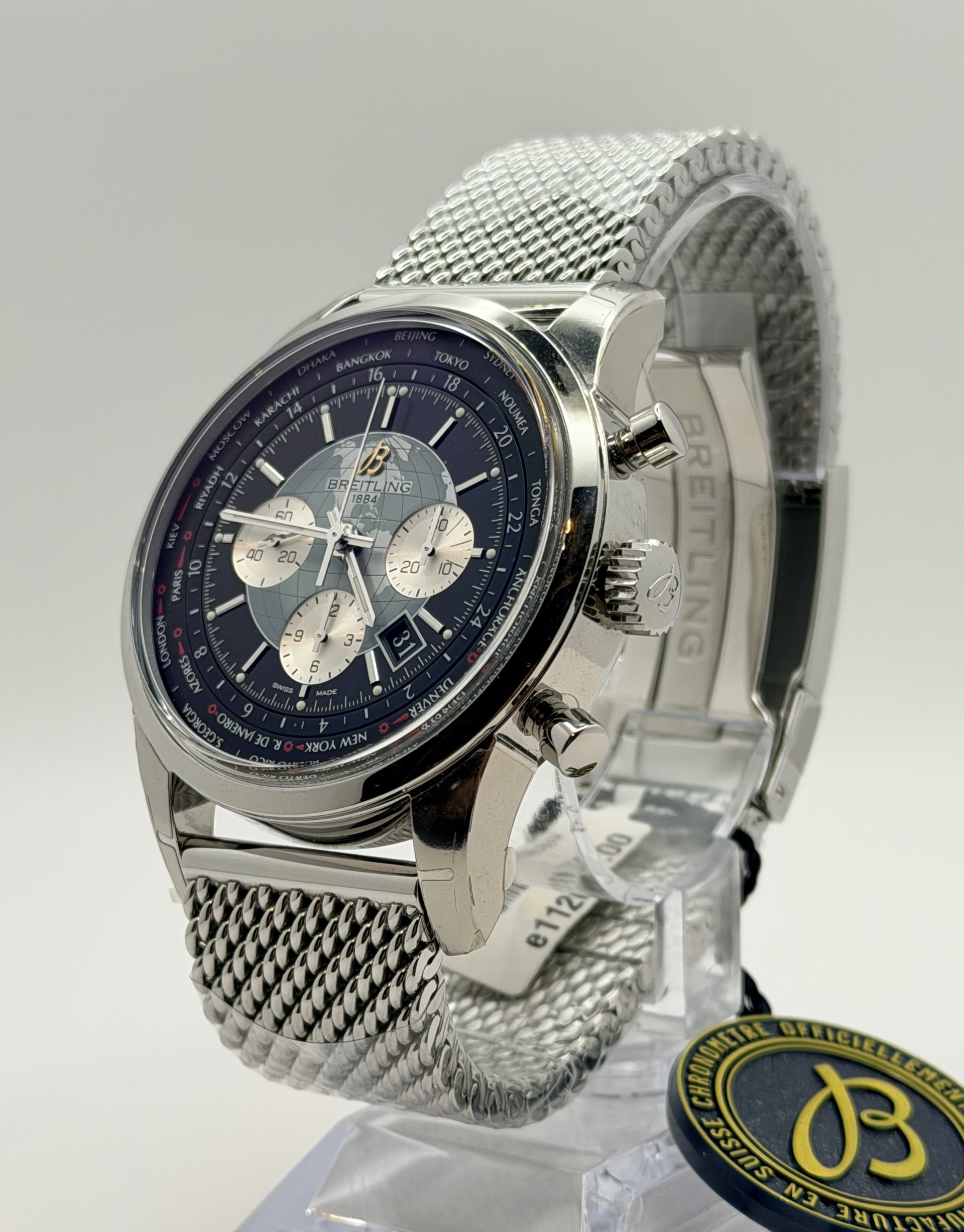 Breitling Transocean Chronograph Unitime on elegantti ja teknisesti vaikuttava matkailijan kello, joka yhdistää klassisen muotoilun ja edistyneen kellotekniikan. Tämä vuonna 2024 valmistettu yksilö kuuluu Transocean-mallistoon, joka on tunnettu ajattomasta tyylistään sekä Breitlingin vahvasta ilmailu- ja matkustushistoriasta inspiroituneesta designista.
