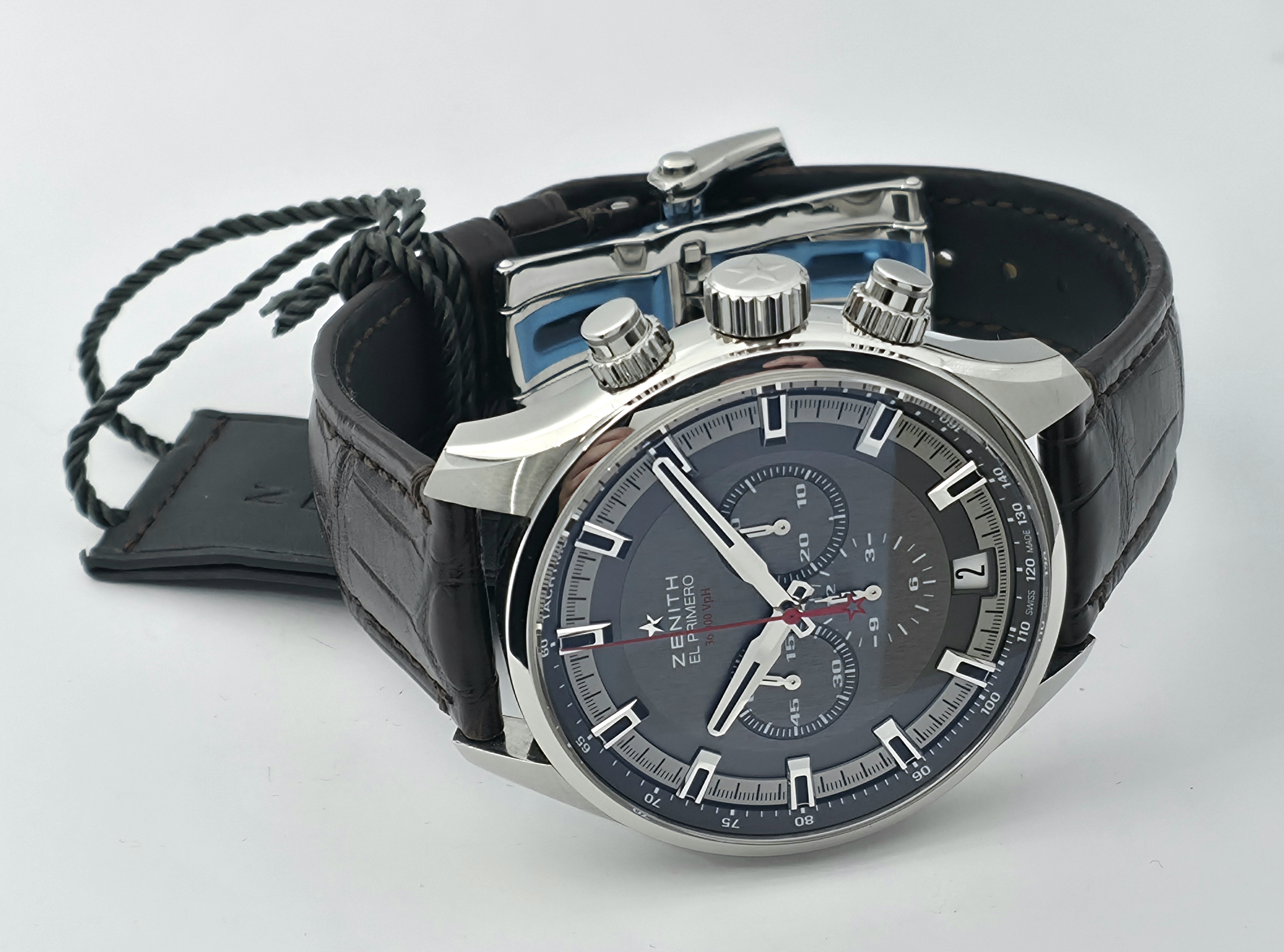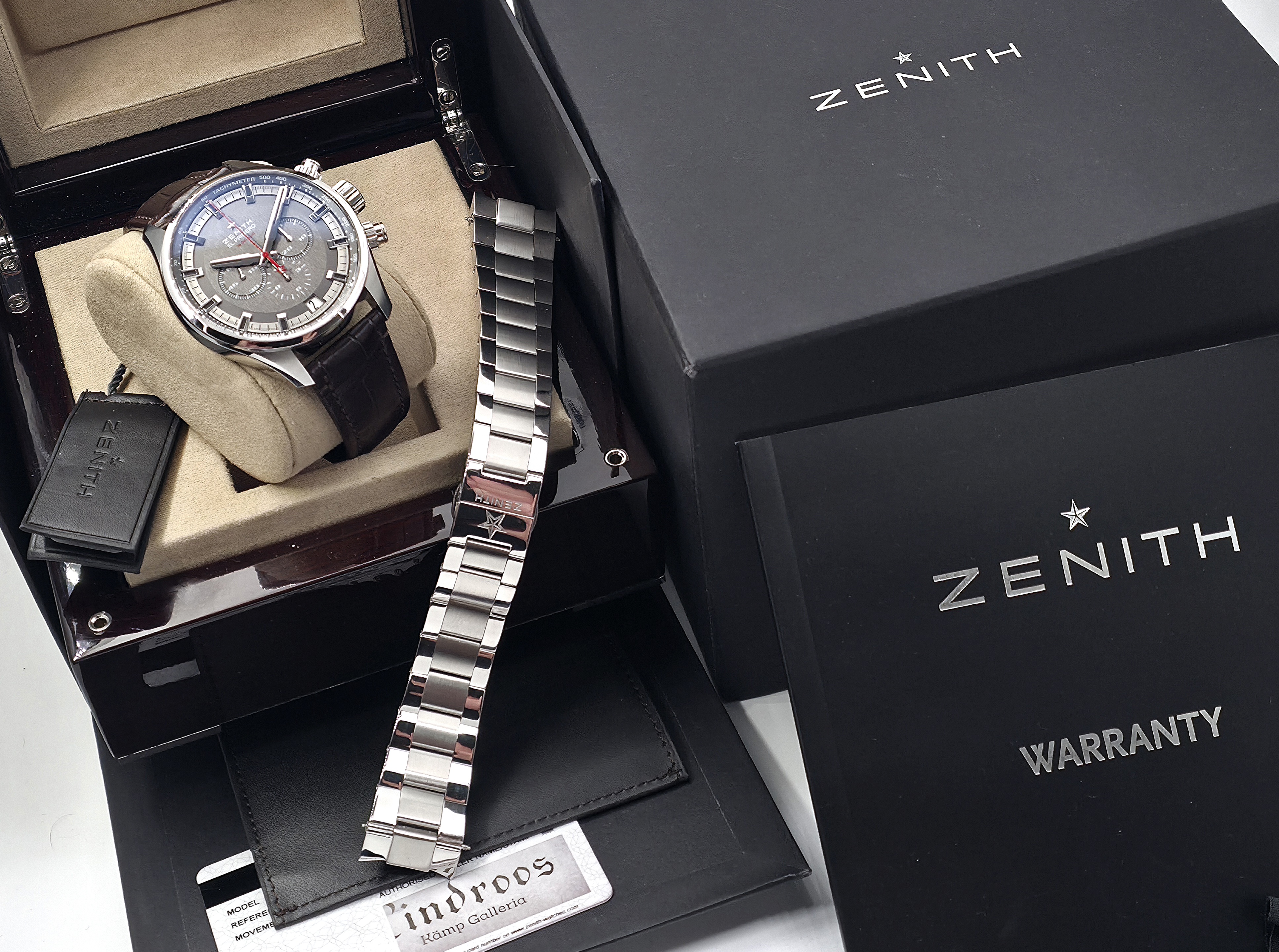 Erittäin näyttävä Zenith El Primero Sport. Kyseessä on 45 mm malli, jossa on upea harjattu harmaa kellotaulu ja ikoninen El Primero 400 -koneisto. Kellon mukana tulee alkuperäinen nahkaranneke linkkulukolla (käyttämätön) sekä erikseen hankittu mallin oma teräsranneke. Lindroosilta 05/2023 ostettu fullset. Ovh. 9700e