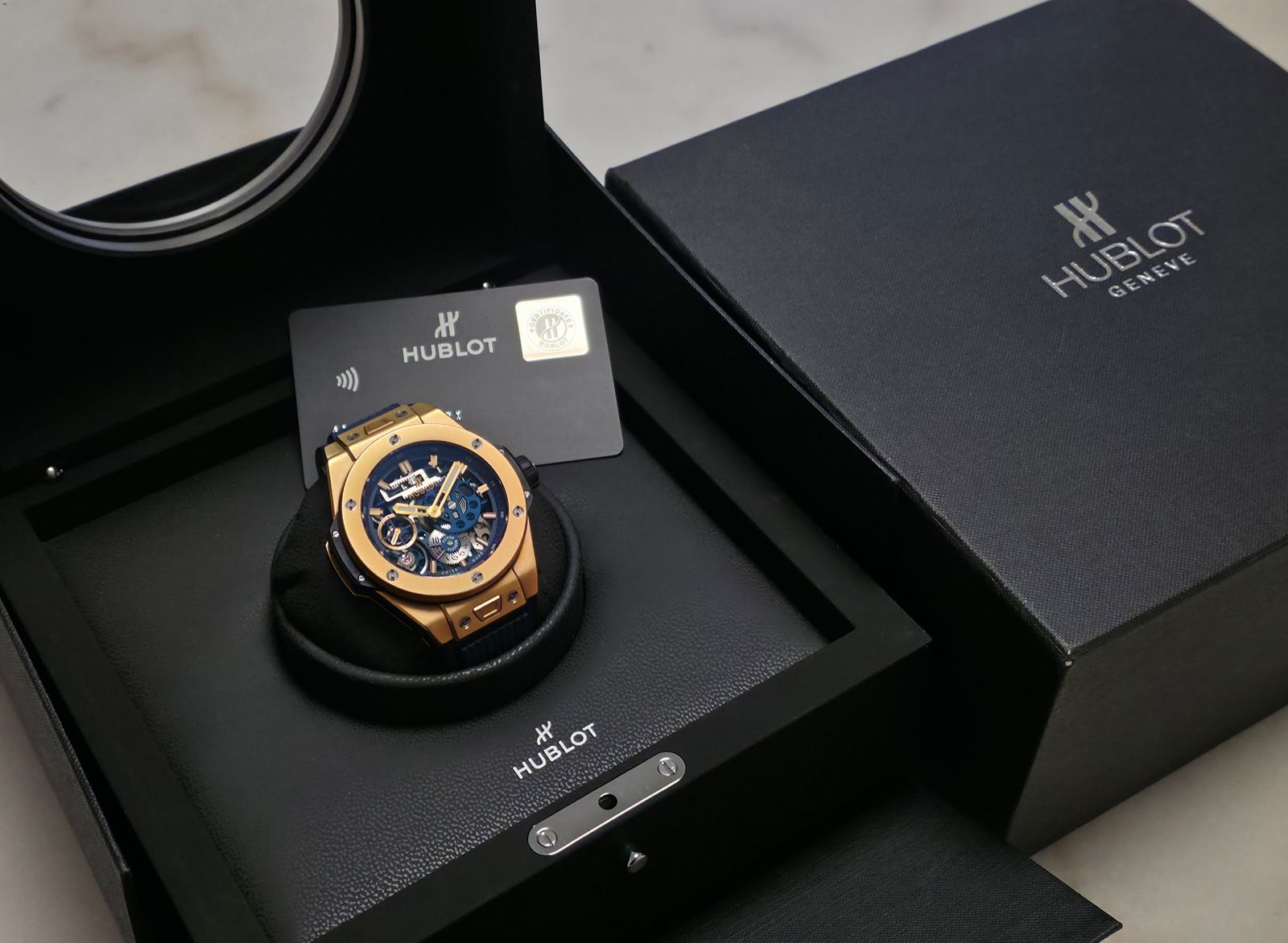 Hublotin erittäin näyttävä 18k mattakultainen Big Bang MECA-10 -malli. Kellossa on upea skeleton-taulu ja kauniisti viimeistelty Meca-10-koneisto, jonka käyntivara on 10 päivää. Kyseessä on täysi setti 05/2018, ja kello on erinomaisessa kunnossa. Ovh. 49 500e