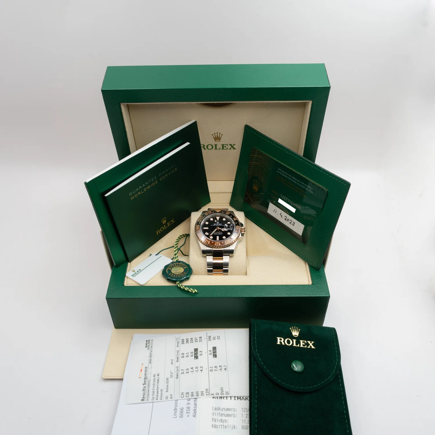 Hienossa kunnossa oleva haluttu ja kiillottamaton Rolex GMT-Master II ref. 126711CHNR “Root beer”, jossa koneistona cal. 3285, n. 70 h käyntivaralla. Kello on ostettu uutena Lindroosilta Suomessa 4/2023, joten tehdastakuu on voimassa 4/2028 asti.