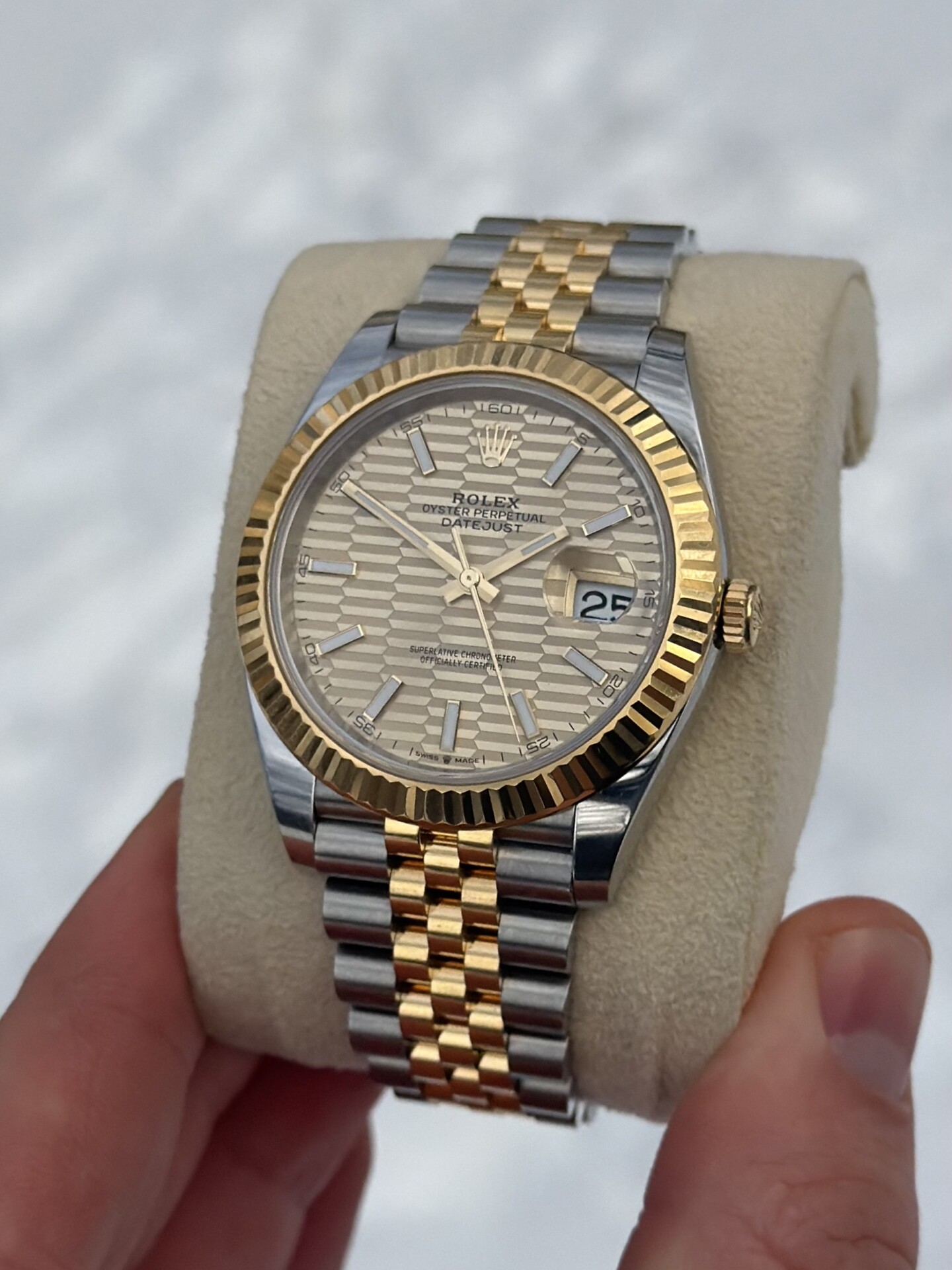 Erittäin hyvässä kunnossa oleva Rolex Datejust harvinaisella ja tuotannosta lopetetulla motif-taululla. Klassinen teräksen ja keltakullan yhdistelmä – kultainen fluted-kehä sekä ajaton jubilee-ranneke tekevät tästä kellosta poikkeuksellisen elegantin ja halutun. Motif-taulu tuo kelloon upeaa, omanlaistaan persoonallisuutta ja tyylilä.