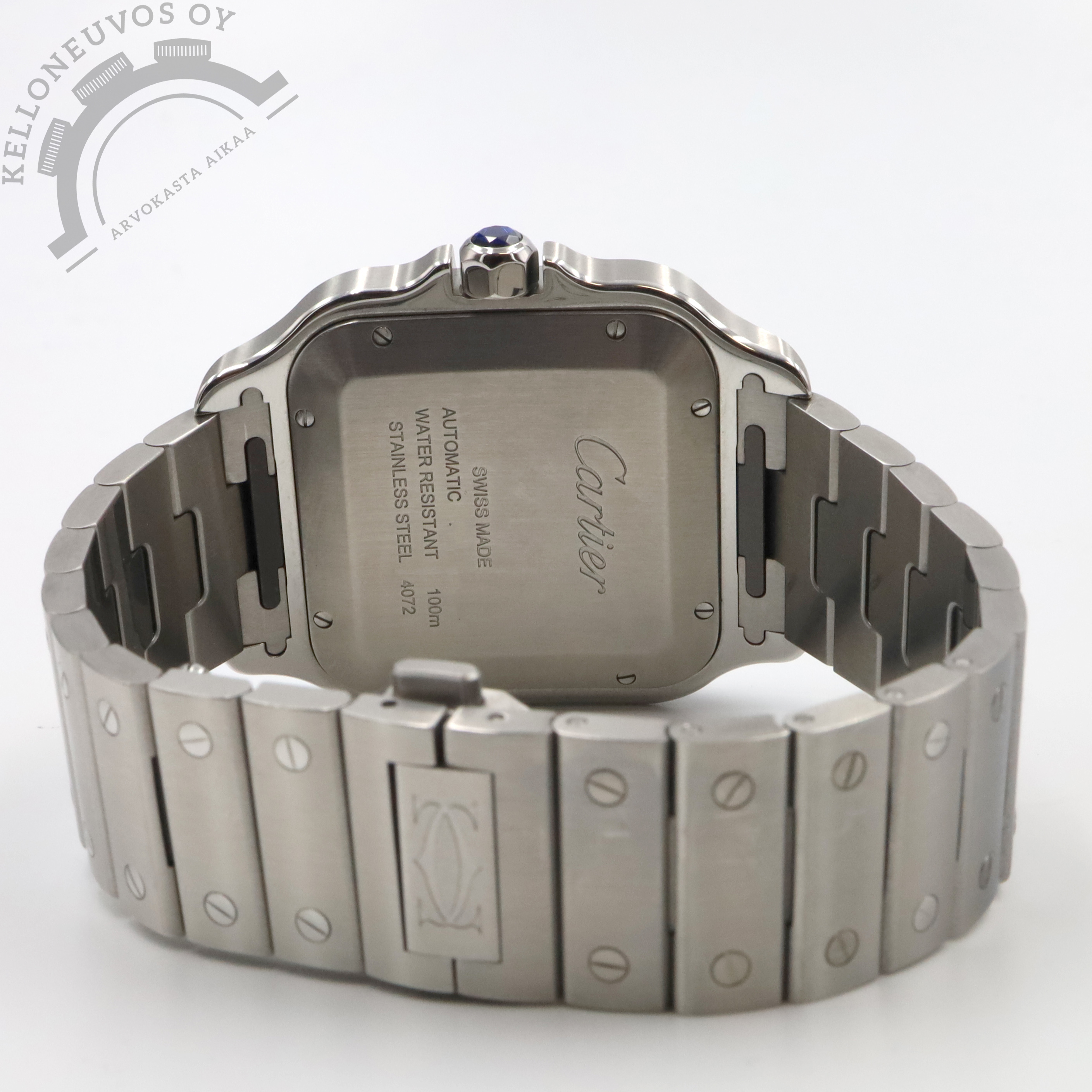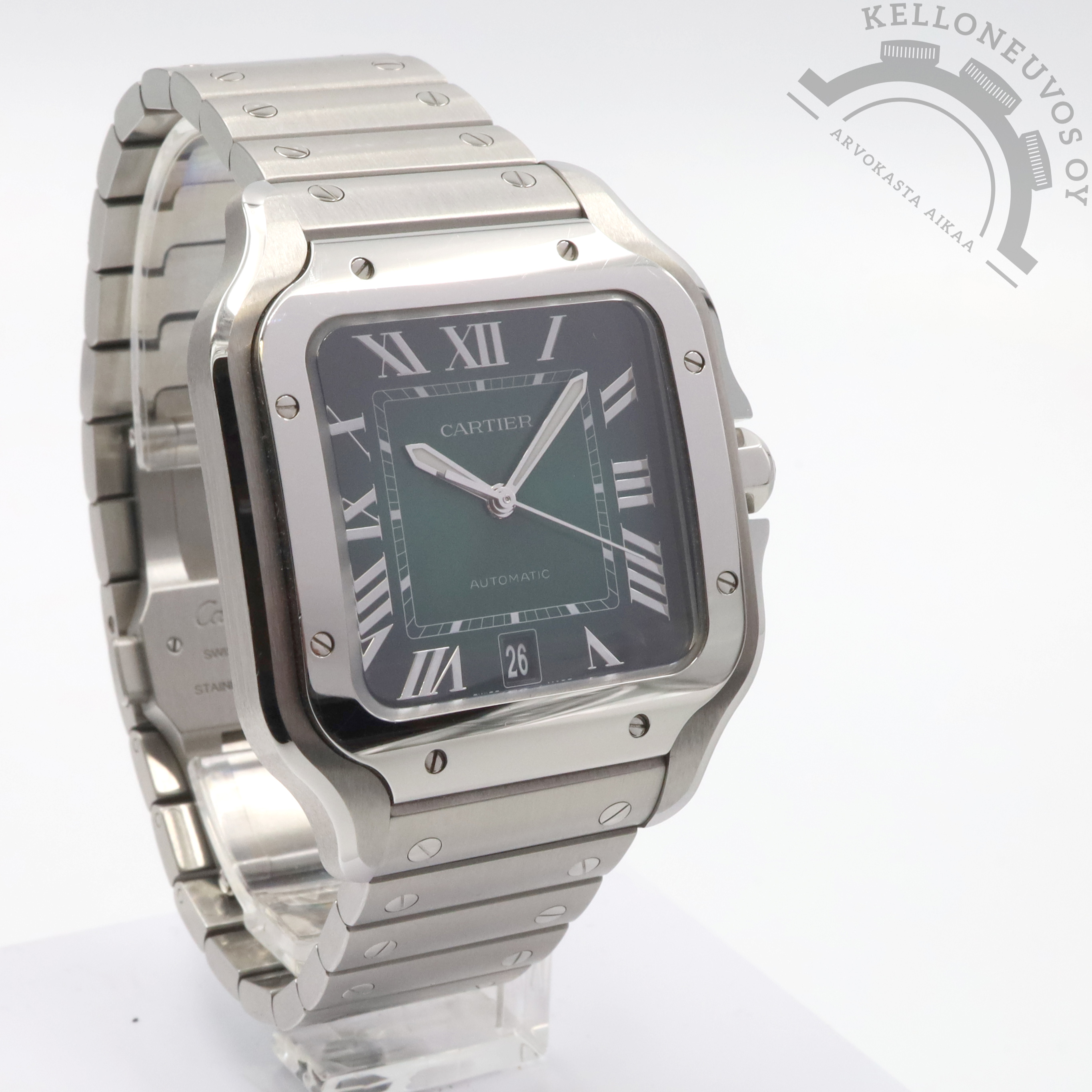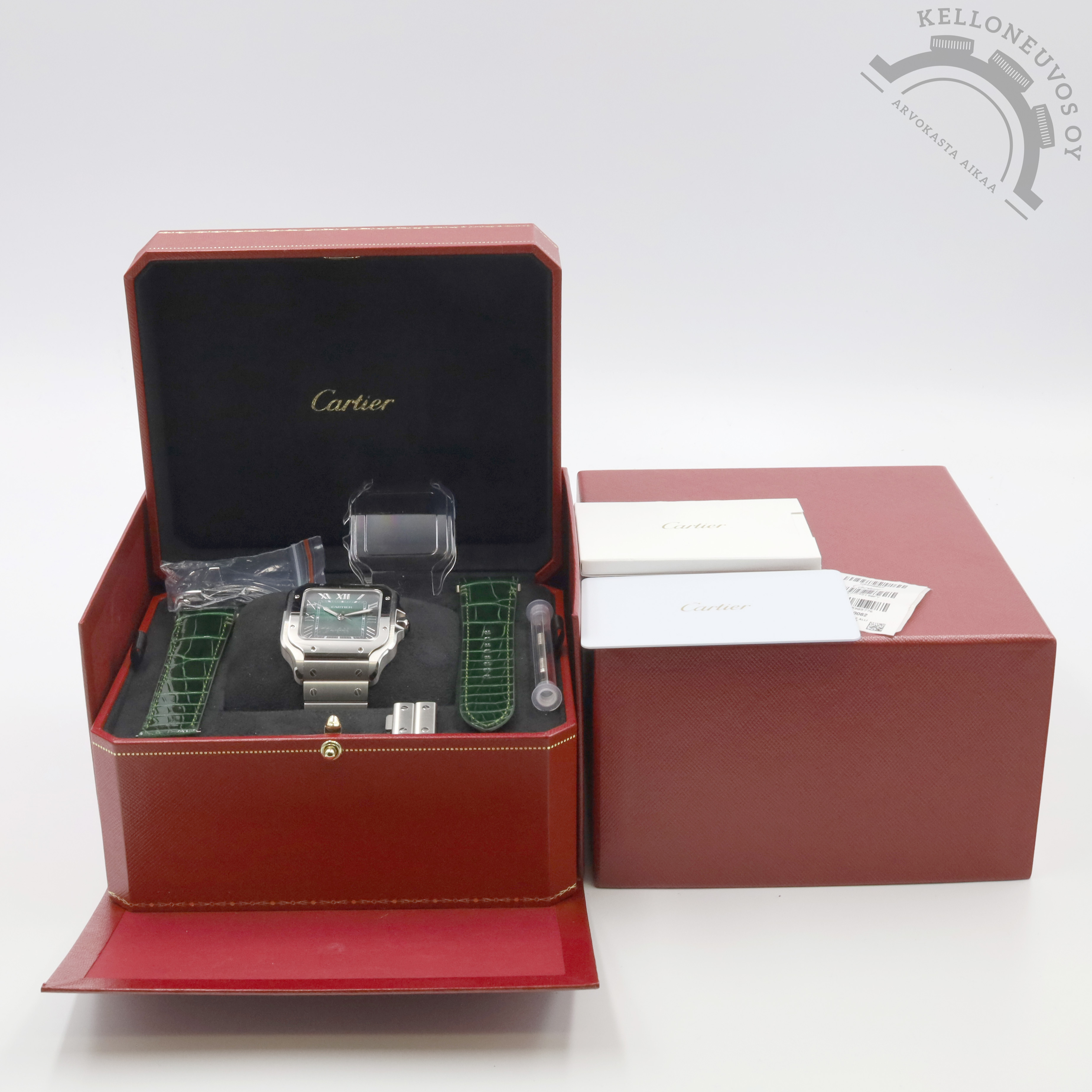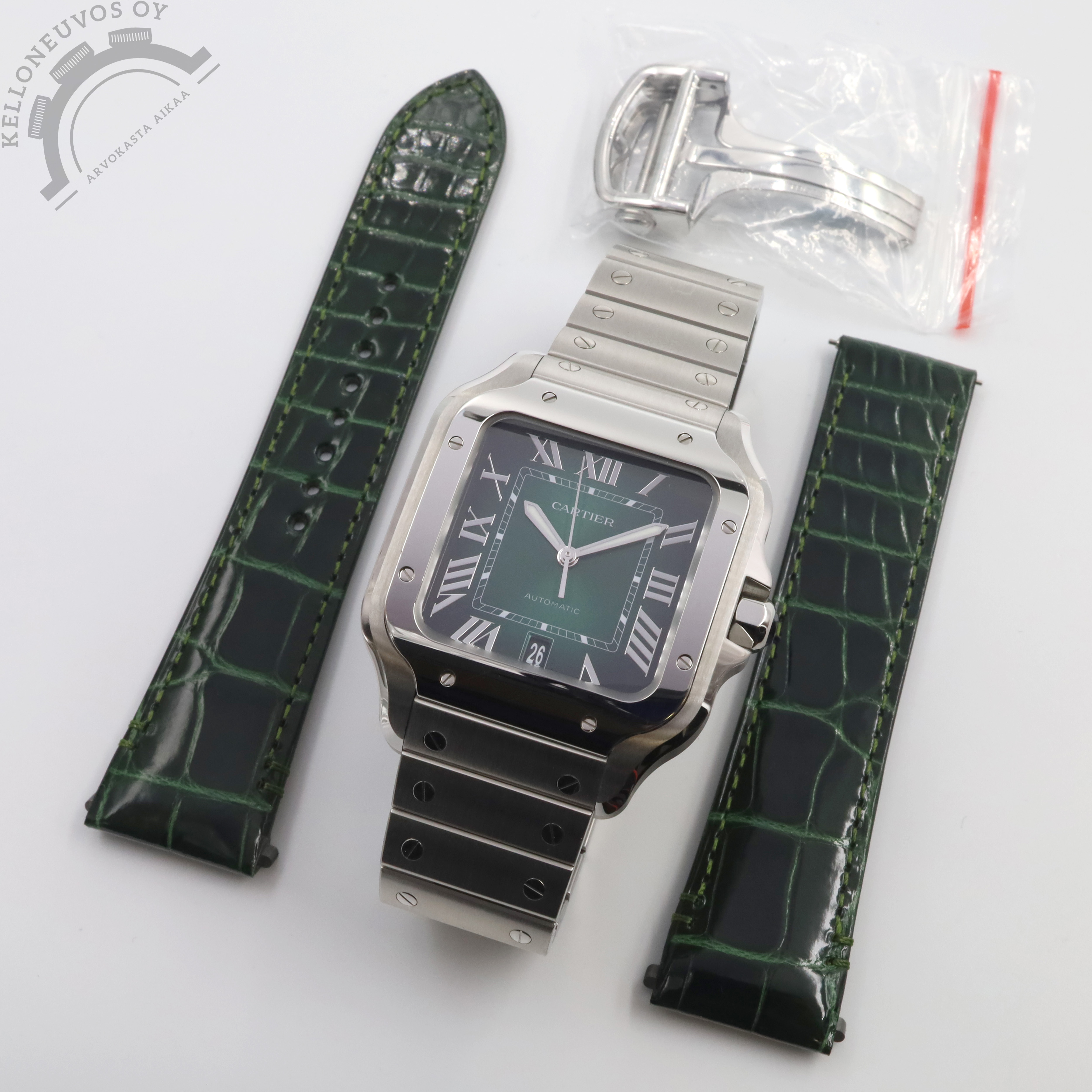 Tarjolle tuoreilla papereilla varustettu large kokoinen Cartier Santos. Upealla vihreällä taululla joka varustettu päivyrillä ja roomalaisilla indekseillä. Teräksinen kuori kiillotetulla teräksisellä kehällä. Rannekkeina kiinni oleva miellyttävän ranneistuvuuden omaava teräsranneke sekä käyttämättömät vihreät nahkarannekkeet omalla soljella. Koneistona toimii Cartier 1847 MC- automaatti 40h käyntivaralla. Full set, kellon elektroninen takuukortti on aktivoitu 9/2025. Ovh. 9 300e.